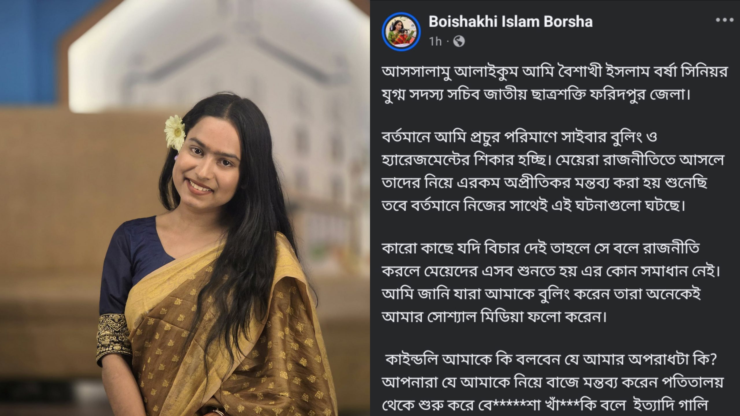 ফরিদপুরে নারী রাজনীতিকদের বিরুদ্ধে সামাজিক যোগাযোগ মাধ্যমে অপ্রীতিকর মন্তব্য ও সাইবার বুলিংয়ের ঘটনা নতুন কিছু নয়। তবে এবার সেই তিক্ত অভিজ্ঞতার শিকার হয়েছেন জাতীয় ছাত্রশক্তি ফরিদপুর জেলা শাখার সিনিয়র যুগ্ম সদস্য সচিব বৈশাখী ইসলাম বর্ষা।