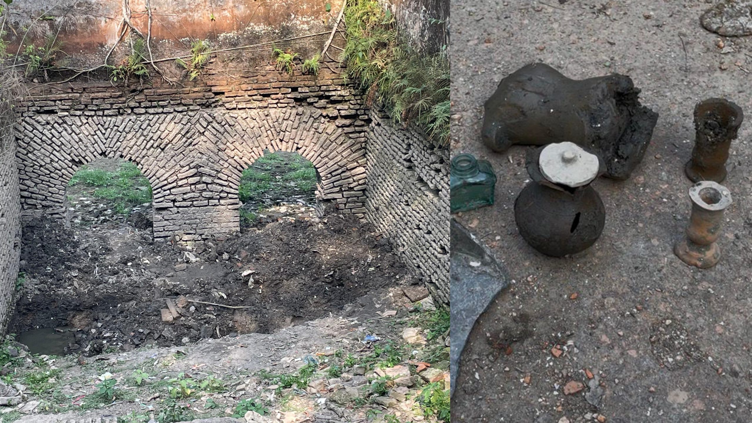 শুক্রবার (২৪ এপ্রিল) সকালে সরেজমিনে দেখা যায়, জমিদার বাড়ির পুকুর সংলগ্ন বউঘাটের নিচের অংশ খুঁড়ে মাটি সরিয়ে ফেলা হয়েছে। খননস্থলে ছড়িয়ে রয়েছে পাথরের ভাঙা মূর্তি, প্রাচীন তৈজসপত্রের অংশ, পাথরের থালা ও পূজার সামগ্রীর ভগ্নাংশ—যা স্থাপনাটির ঐতিহাসিক গুরুত্বেরই সাক্ষ্য বহন করছে।