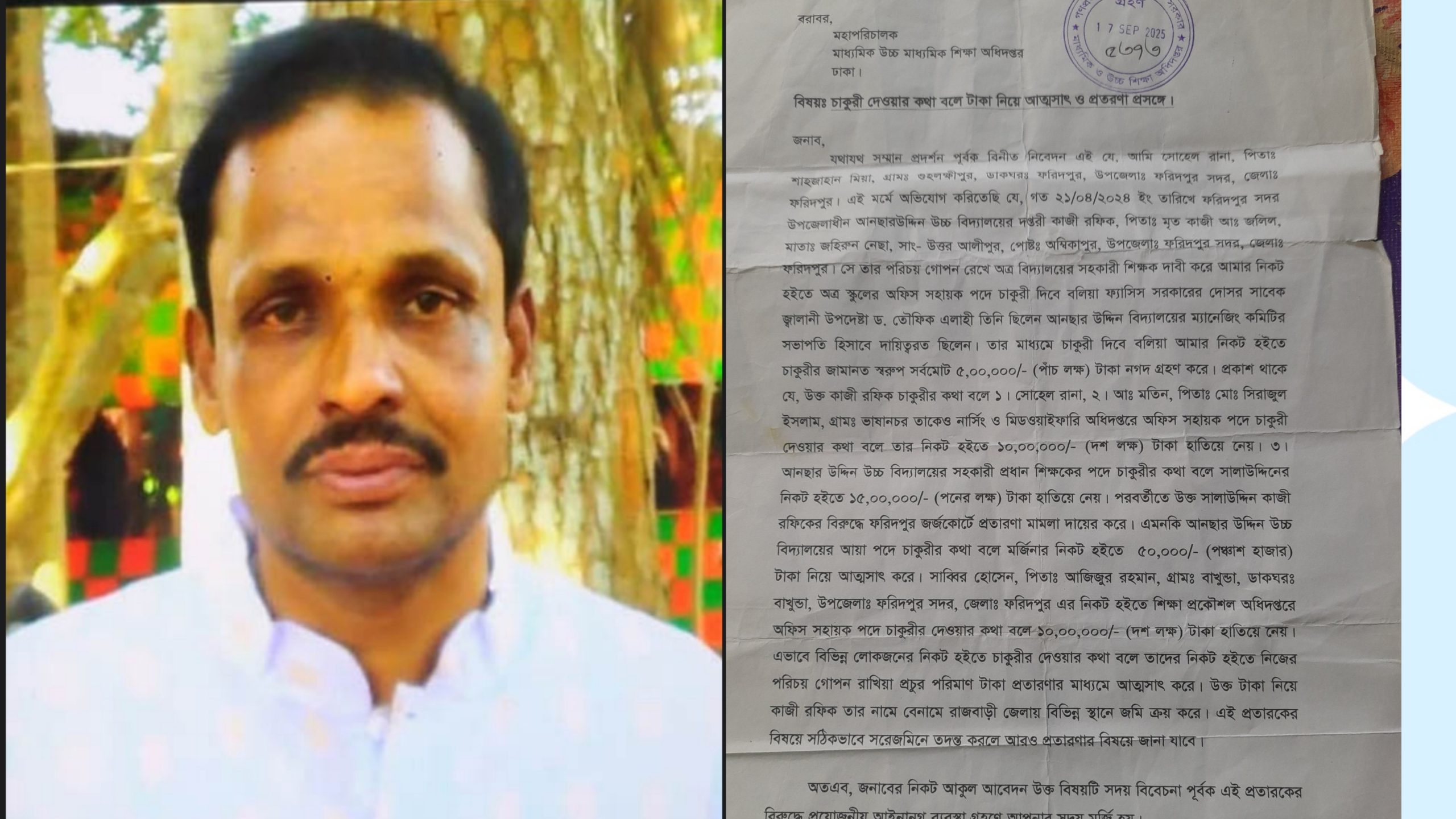 তিনি আরও অভিযোগ করেন, মিথ্যা প্রত্যয়নপত্রের মাধ্যমে দুইবার মামলা থেকে অব্যাহতি পাওয়ার পর অভিযুক্ত কর্মকর্তারা ফরিদপুরের স্থানীয় কিছু ঠিকাদারের সহায়তায় তার ওপর বিভিন্নভাবে চাপ ও ভয়ভীতি সৃষ্টি করছেন।
